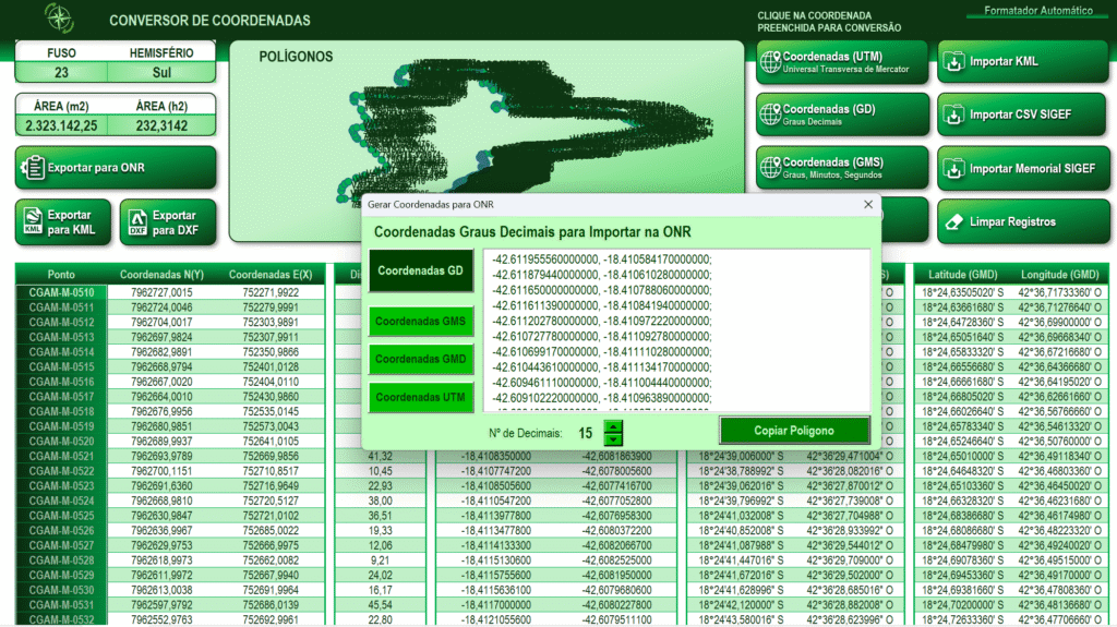 Tudo automatizado, 100% compatível com o padrão exigido pelo mapa ONR, com resultado final pronto para copiar e colar no sistema.